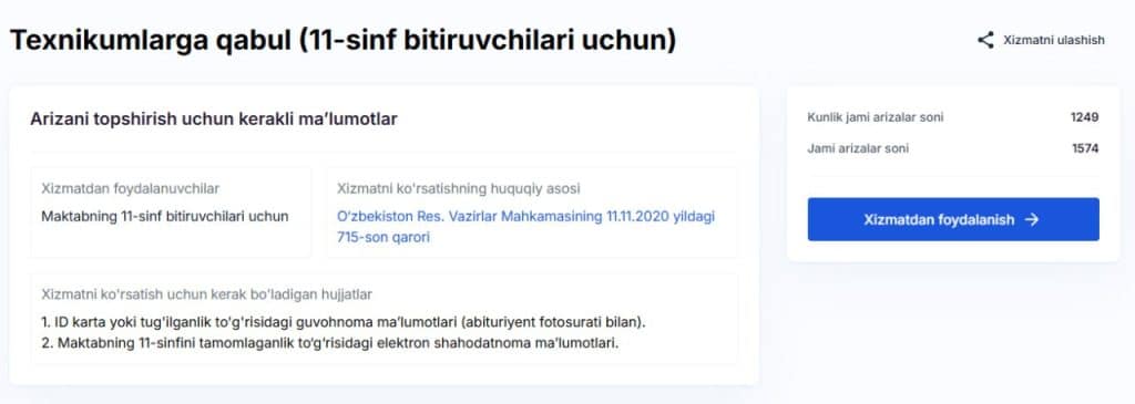 Kasbiy ta’lim tashkilotlariga qabul boshlandi Kasbiy ta’lim tashkilotlariga kamida umumiy o‘rta ma’lumot negizida boshlang‘ich, o‘rta va o‘rta maxsus kasbiy ta’lim dasturlari bo‘yicha kunduzgi, kechki va dual ta’lim shakllariga abituriyentlarning hujjatlari my.edu.uzplatformasiorqali 10-sentyabrgacha (shu kuni ham) qabul qilinadi. ▪️Tibbiyot texnikumlariga o‘qishga kirish istagida bo‘lgan abituriyentlar oliy ta’lim muassasalariga tanlov natijalari e’lon qilingan kundan boshlab 10 kun …