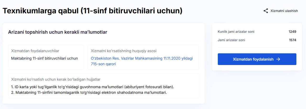 2025/2026-o‘quv yili uchun kamida umumiy o‘rta ma’lumot negizida 549 ta texnikumga jami 143 ming 114 ta (shundan 66 ming 484 ta davlat granti) qabul parametrlari tasdiqlangan. Shundan: