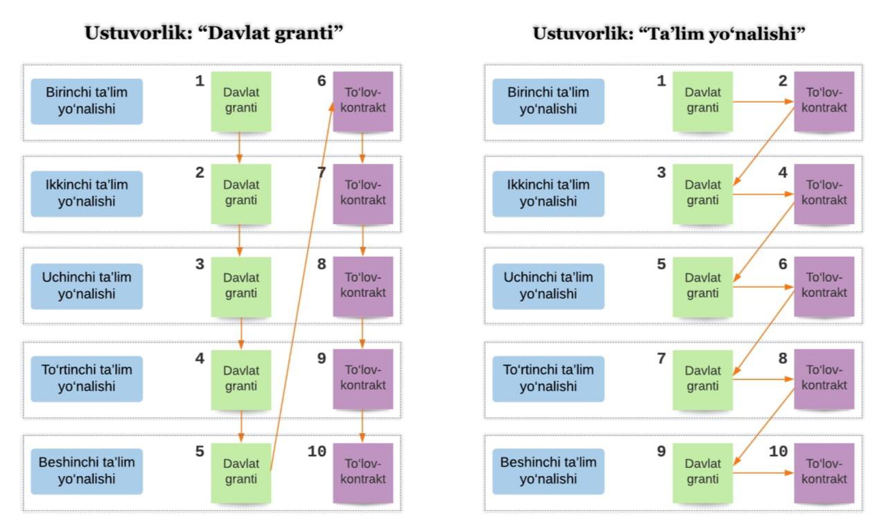🔹 Ta’lim yo’nalishini tanlasa — avval har bir taʼlim yo‘nalishida davlat granti va to‘lov-kontrakt asosida ketma-ket tanlovda ishtirok etadi.