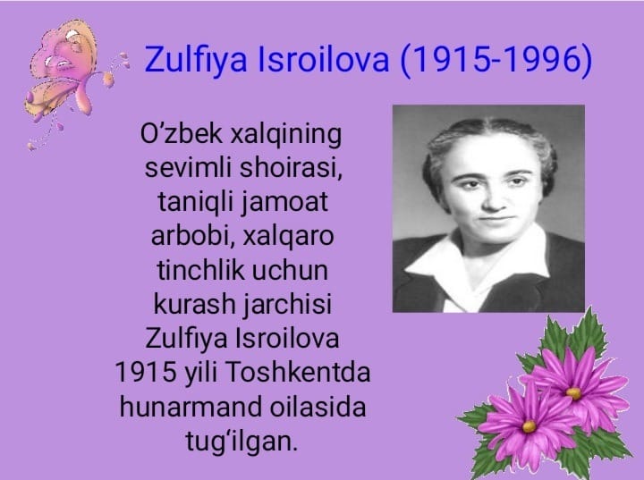 Zulfiyaxonim tavallud kuni uchun tadbir ssenariysi Zulfiyaxonim: O‘zbek xalqining sevimli shoirasi, taniqli jamoat arbobi, xalqaro tinchlik uchun kurash jarchisi Zulfiya Isroilova 1915 yil Toshkentda Hunarmandlar oilasida tug‘ilgan. Tadbir senariysi 1-Mart Zulfiya tavalludiga ssenary! She’riyat tongining yulduzi Bahor valsi musiqasi ostida o’quvchilar kirib kelib tadbir boshlanadi. 2 nafar o’quvchi “Bahor keldi seni so’roqlab” she’rini aytishadi. Salqin saharlarda, bodom …
